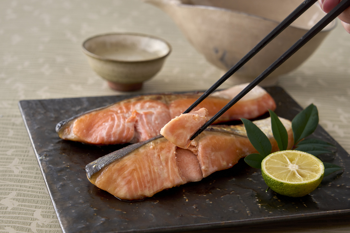 それぞれに宮城県塩竃の酒蔵、浦霞の酒粕を使用しており、脂乗りのいい銀鮭をしっかりと優しい味で包んで、薫り高く仕上げています。